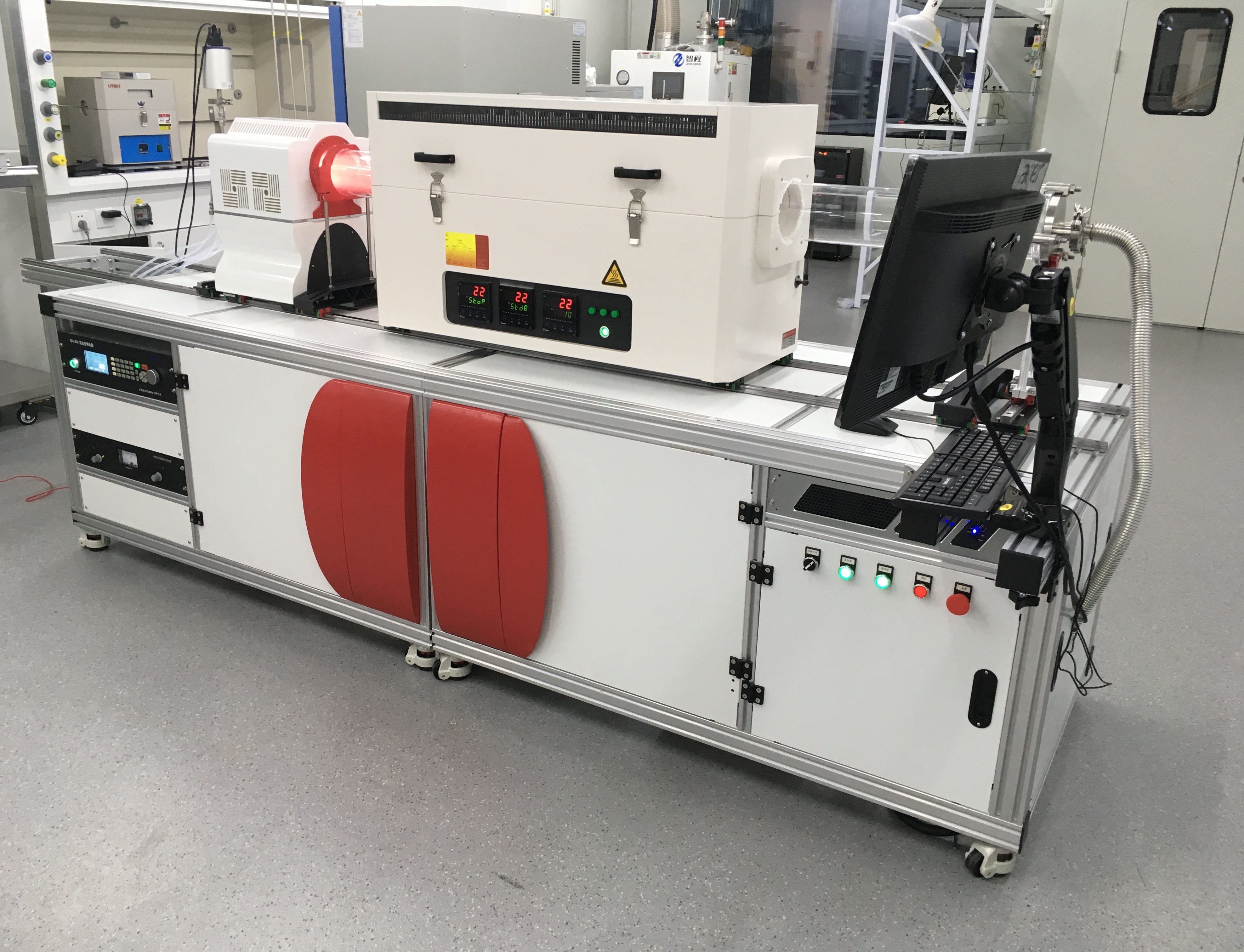 等離子體增強(qiáng)化學(xué)氣相沉積系統(tǒng)(PECVD),三溫區(qū)CVD系統(tǒng),生長樣品腔的管徑60-120mm,它是由高溫管式爐、多路高精度流量控制與供氣系統(tǒng)、機(jī)械泵、真空密封及測量系統(tǒng)、尾氣處理系統(tǒng)組成,極限真空度可達(dá) 10^-5 torr 。