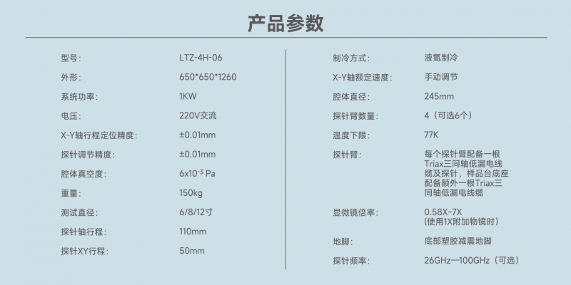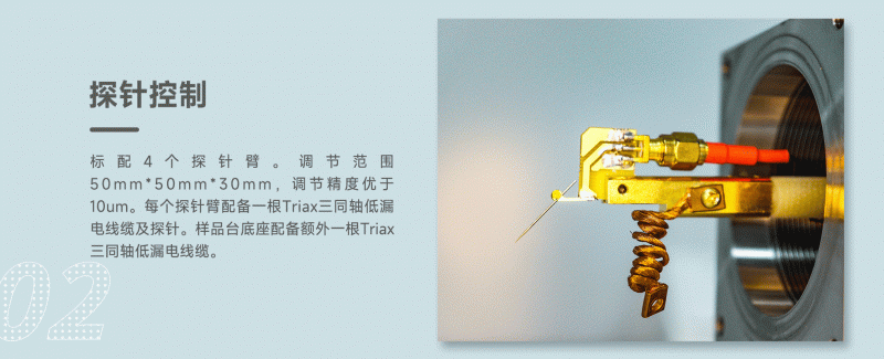 2. 探針控制:標配4個探針臂。調(diào)節(jié)范圍50mm*50mm*30mm,調(diào)節(jié)精度優(yōu)于10um。每個探針臂配備一根Triax三同軸低漏電線纜及探針。樣品臺底座配備額外一根Triax三同軸低漏電線纜;