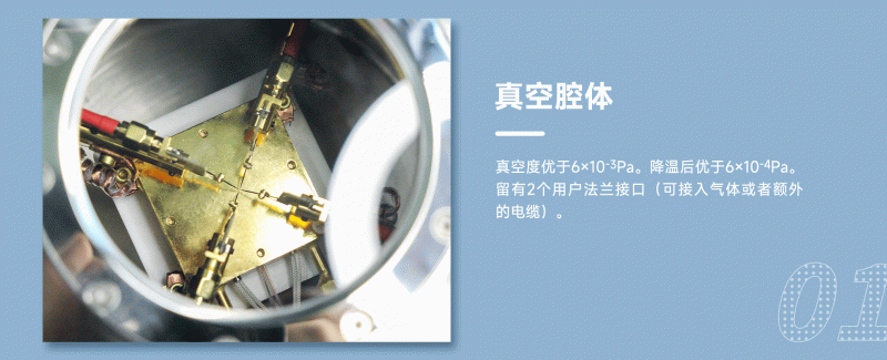 1.真空腔體:真空度優(yōu)于6×10-3Pa。降溫后優(yōu)于6×10-4Pa。留有2個用戶法蘭接口(可接入氣體或者額外的電纜);